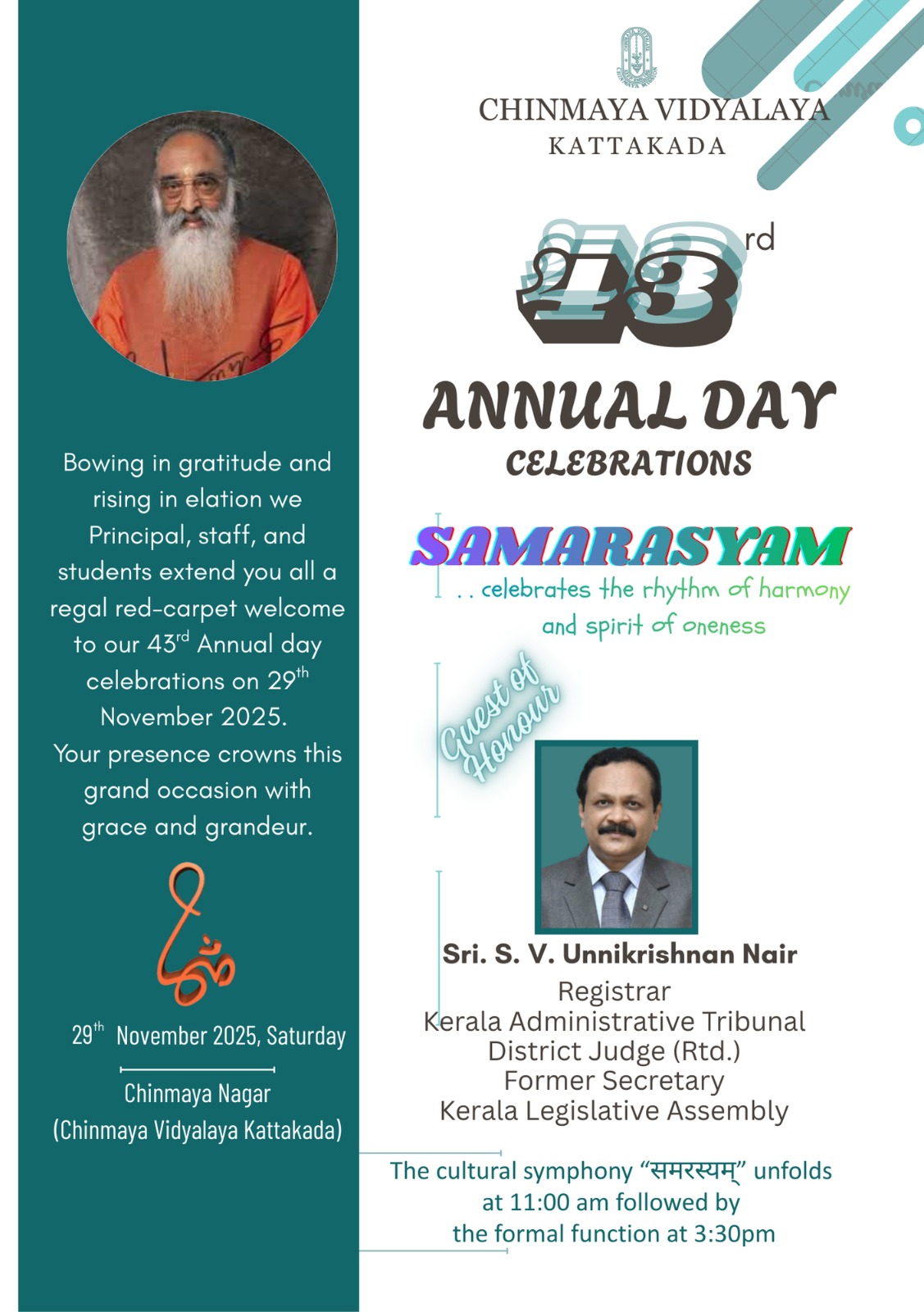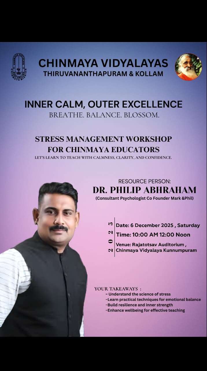 “True knowledge removes all that is false in our life” . With immense pleasure, I welcome you all to our Vidyakshethra- Chinmaya Vidyalaya Kattakada to this academic year. Chinmaya Vidyalaya bestows a vision to enshrine the philosophy of education in the heart of every growing child, to bring out the infinite potential within. Paramount to the academic excellence, every child in the vidyalaya can touch the magic of learning environment where you can pursuit your dreams and reach your highest potential. Royal steps into the vidyalaya will not just leave the academic years but truly be prepared to face life’s challenges.
